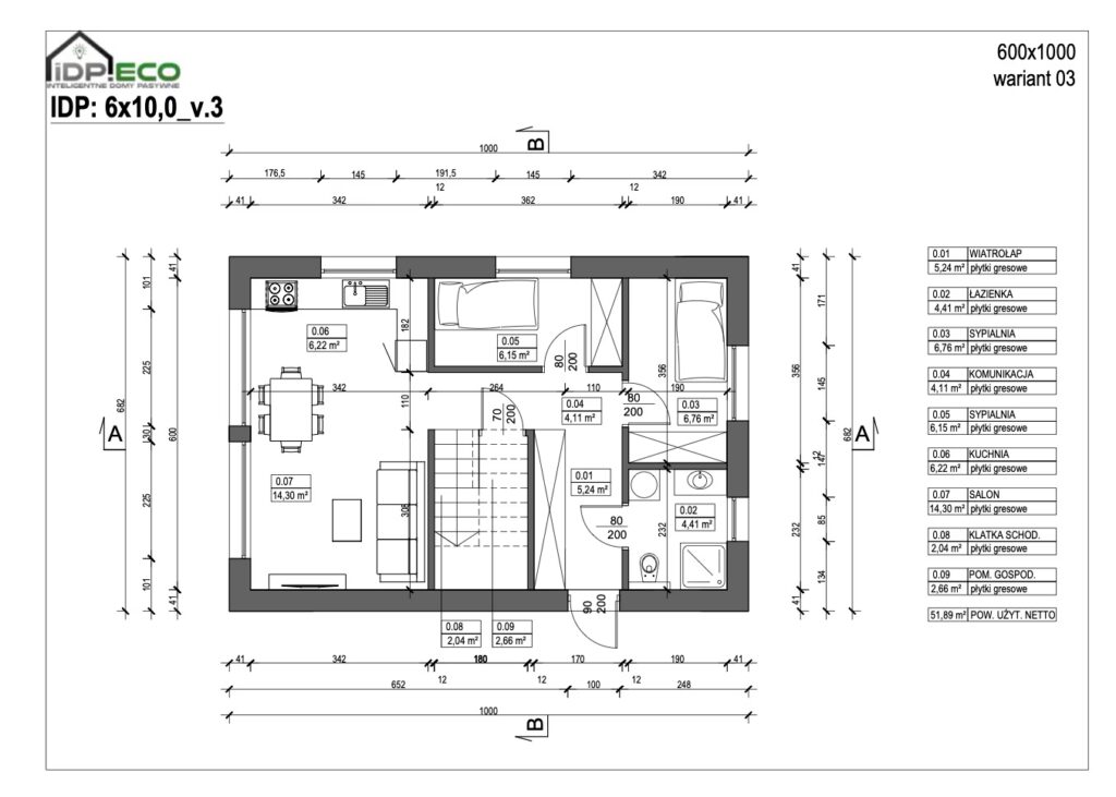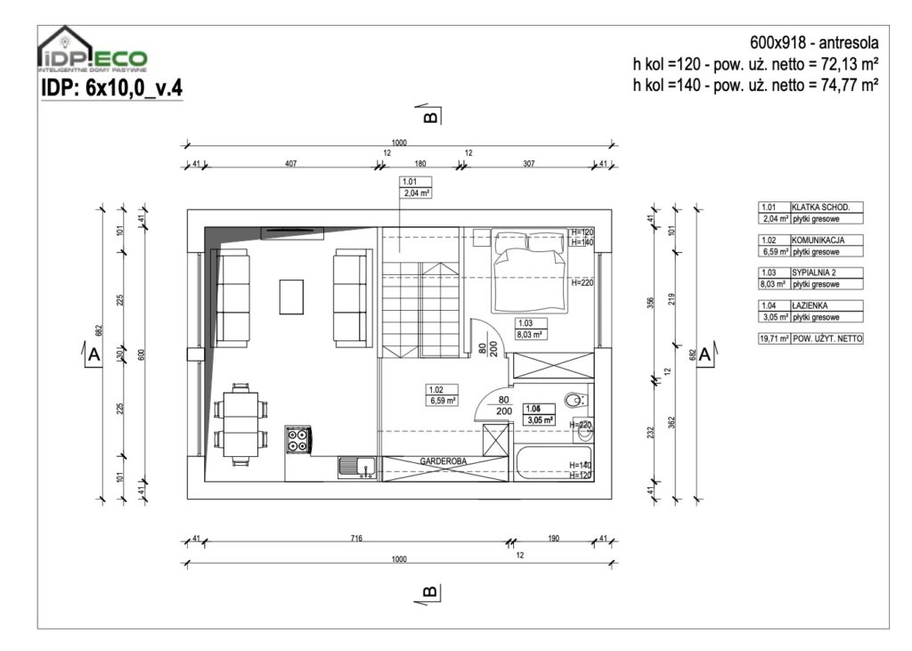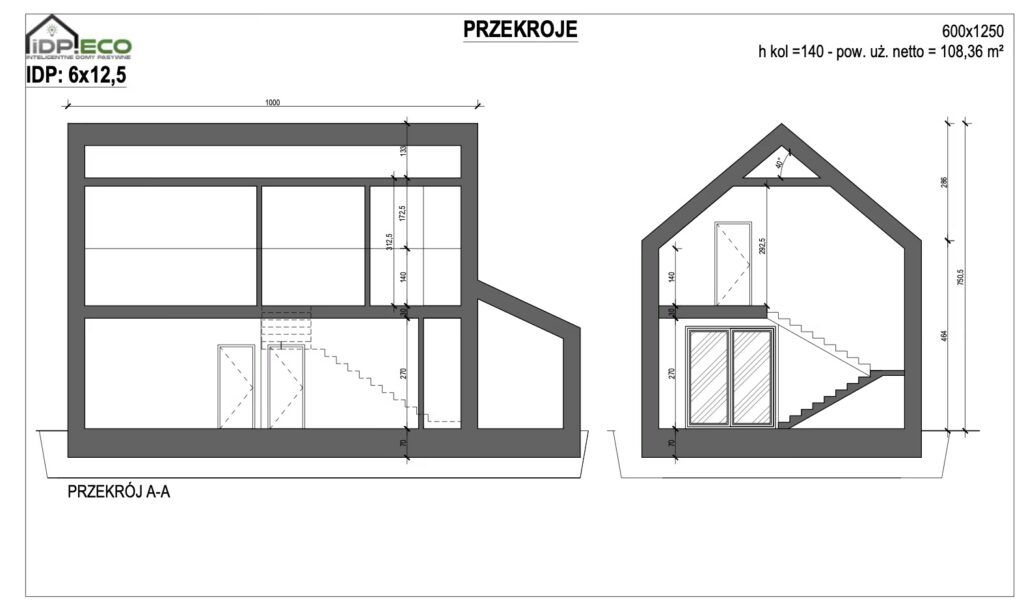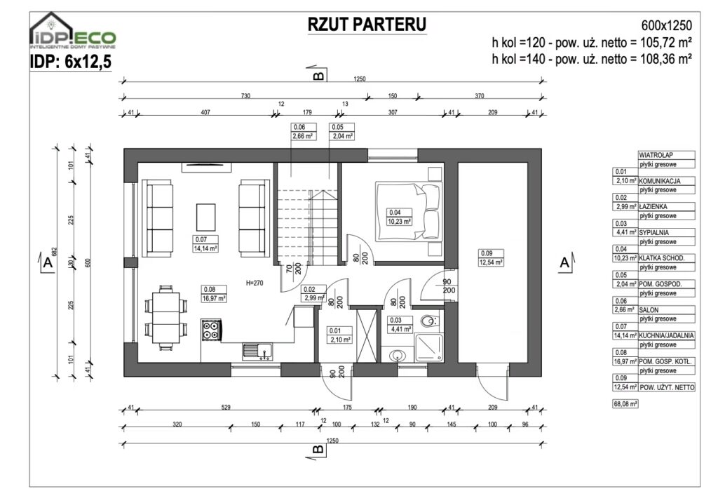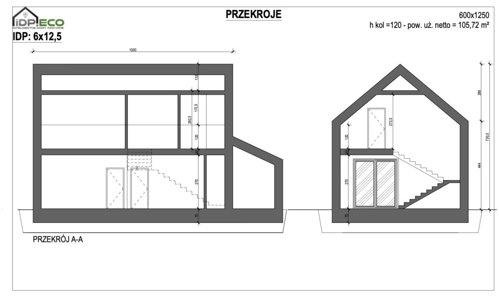 - Powierzchnia użytkowa: 105,72 m2 (h kol 120cm)/ 108,36 m2 (h kol 140cm)